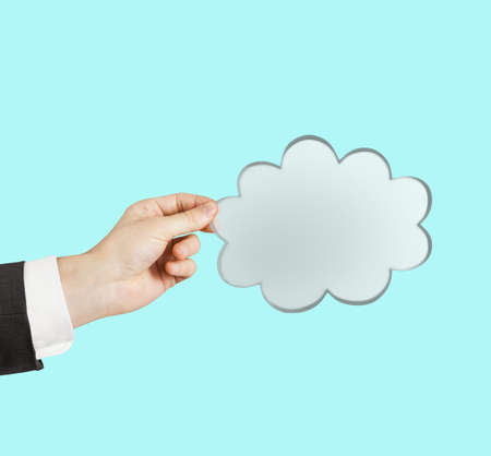 Holding a white cloud in the hand, empty copy space for text, blue background, communication and marketing concept, being connected, networking