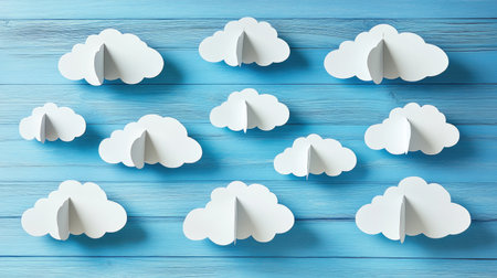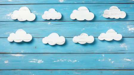 Blue wooden background with white clouds for a baby boy photo shoot, a simple backdrop for a studio portrait. A light blue wooden surface with paper cutouts of clouds, a pastel color scheme, and a minimalist style, all captured in high-definition photography. --chaos 30 --ar 16:9 --v 6.1 Job ID: fa41ffa9-146b-4945-ba16-ff53a9db1dfa