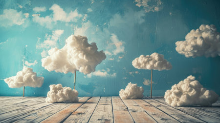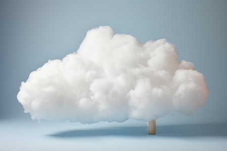 Soft and fluffy cloud illustration on a wooden base, showcasing creativity and tranquility against a pastel blue background, perfect for themes of imagination and serenity