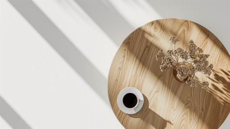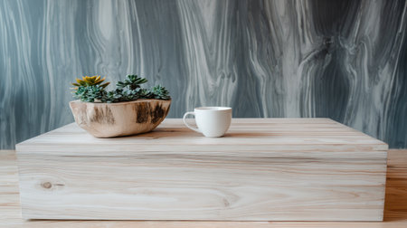 A beautiful wooden table showcases a minimalist aesthetic, adorned with a succulent plant and a delicate white coffee cup, set against a serene gray backdrop.