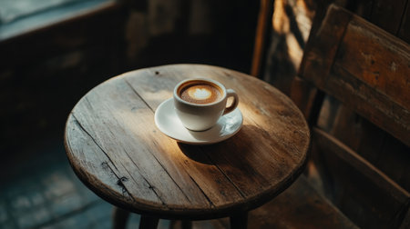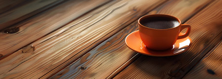 A warm coffee cup rests on a rustic wooden table, showcasing unique grain patterns and a cozy atmosphere. Perfect for lifestyle and beverage themes.