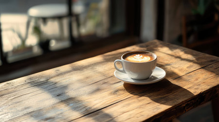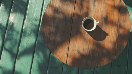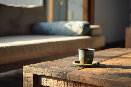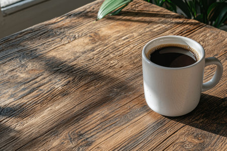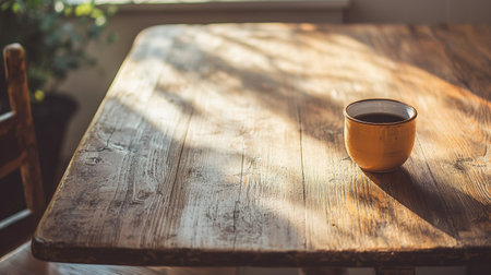 A cozy scene of a ceramic coffee cup on a rustic wooden table, bathed in warm sunlight with soft natural shadows.