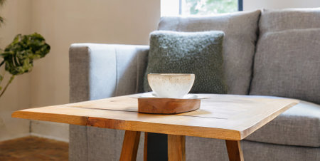 coffee cup on wooden table in modern living room with sofa and sofa