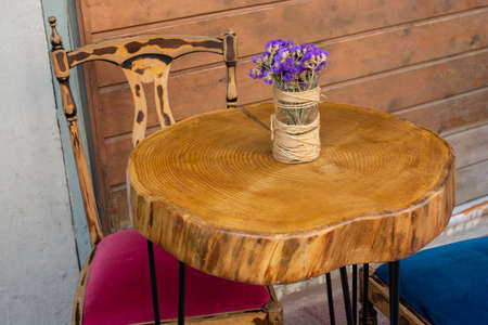 closeup to empty wooden table with chairs and blurred background with cafe area and barista serving organic drinks
