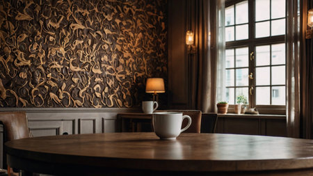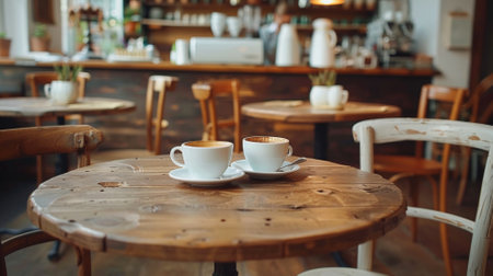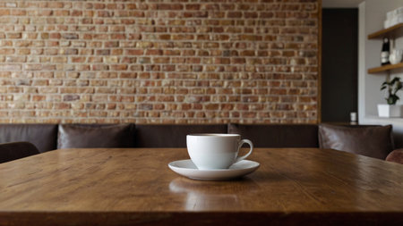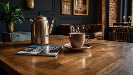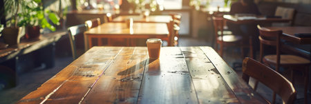 A beautifully crafted wooden table captured in a cozy cafe environment, showcasing a warm and inviting atmosphere ideal for interior design and lifestyle content.