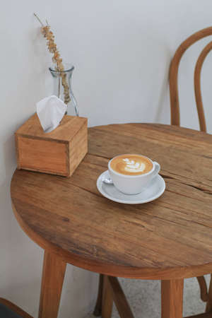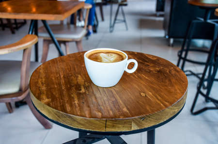 Hot coffee latte art foam on wooden table. Enjoy a morning with a cup of coffee at street cafe, relaxing time holidays.