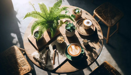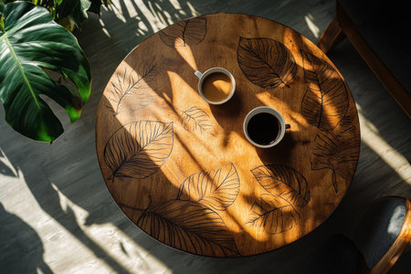 A round wooden table with leaf patterns, with coffee and tea on it, is placed in the center of an indoor living room. The leaves and wood grain texture contrast each other, creating beautiful shadows under sunlight. It has a high resolution and a top-down perspective, with green plants adding vitality to the scene. High definition photography style, in the style of Jean Nouvel. --ar 3:2 --v 6.1 Job ID: 73fc51e0-f07a-4d4d-bb6b-b7502943fa33