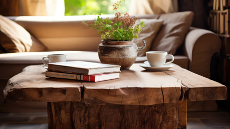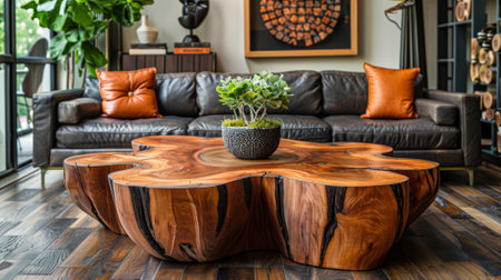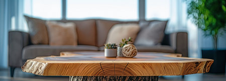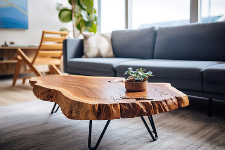 Close up of live edge wooden accent coffee table. AI Generated