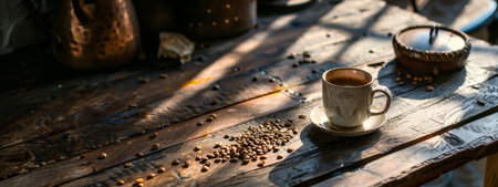 A cozy coffee scene featuring a cup of coffee on a rustic wooden table, with scattered coffee beans. Warm lighting enhances the nostalgic and comforting mood, ideal for café