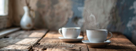 Two white coffee cups with steam rising, placed on a rustic wooden table, creating a cozy and warm atmosphere.