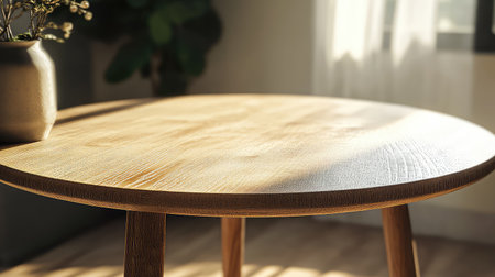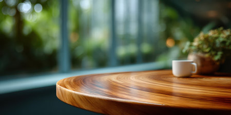 Curved hardwood table with smooth polished surface and white coffee cup in cozy indoor setting with natural light