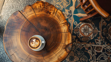 A beautifully crafted latte topped with intricate art sits in a rustic cup on a natural wooden slab in a warm coffee shop setting.