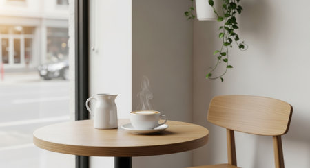 A serene coffee shop scene with a cappuccino, milk jug, and wooden table in soft natural light. Clean, inviting cafe