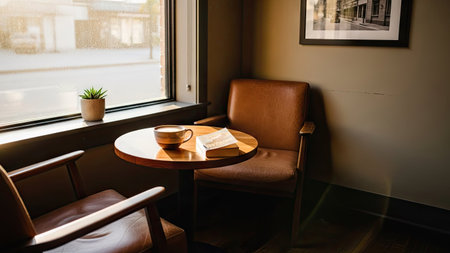 close up shot of two chair and table set in a coffee shop, created with generative ai