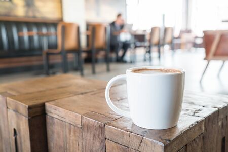 Coffee cup on wooden table in coffee shop, stock photo