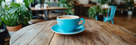 Blue Ceramic Coffee Cup with Freshly Brewed Coffee on a Rustic Wooden Table in Cozy Interior Setting