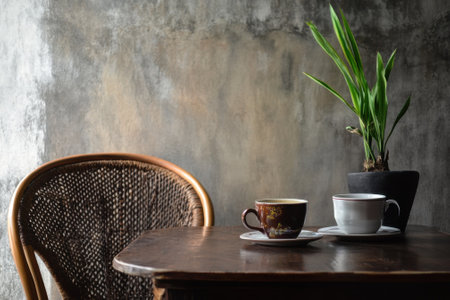 Two coffee cups rest on a wooden table next to a small potted plant in a cozy, rustic cafe environment.