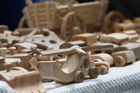 wooden handmade plane and helicopter form models toys sell in outdoor street store market fair.