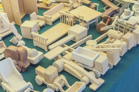 wooden toys on the table. raw parts