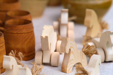 Cute wooden handmade toys for kids on table on tablecloth