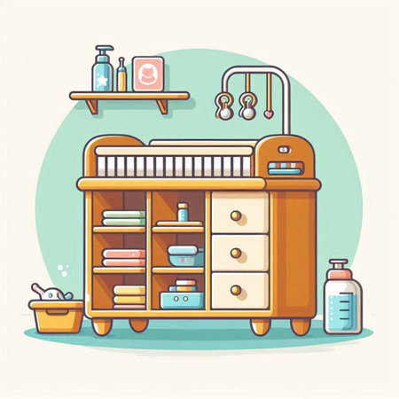 A wooden baby changing table stands in a minimalist nursery with white walls. It is stocked with clean diapers, wipes, lotion, and folded baby clothes, representing readiness for infant care.