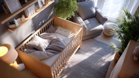 Inviting nursery space with a wooden crib, soft furnishings, and greenery, illuminated by natural light, creating a peaceful environment for babies and parents