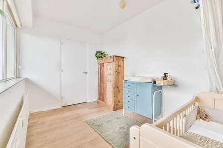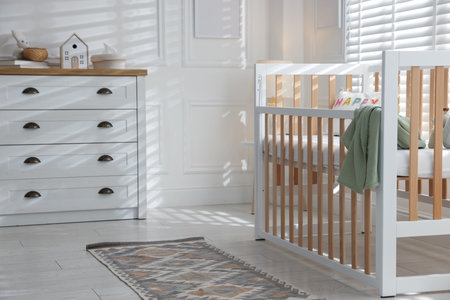 Stylish baby's room with crib and chest of drawers. Interior design