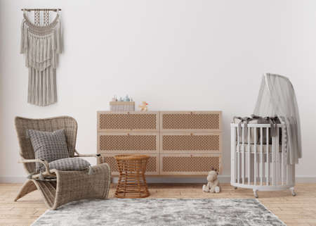 Empty white wall in modern child room. Mock up interior in scandinavian, boho style. Copy space for your picture or poster. Console, rattan armchair, toys, macrame. Cozy room for baby. 3D rendering.