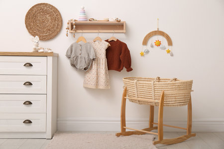 Nursery interior with stylish furniture, clothes and accessories