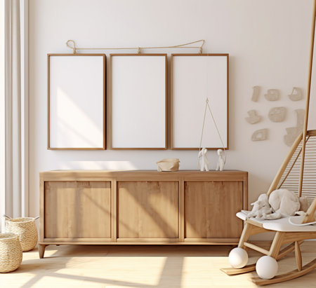 An eye catching illustration of Mock up frame in children room with natural wooden furniture, Farmhouse style interior background. Created using Generative AI tools.