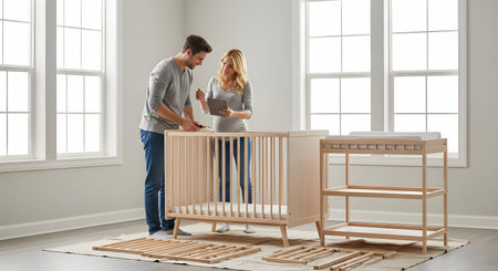 A pregnant woman and her partner work together to assemble a wooden baby crib in a bright, empty nursery room. They are consulting instructions, symbolizing the excitement and preparation for their new arrival.
