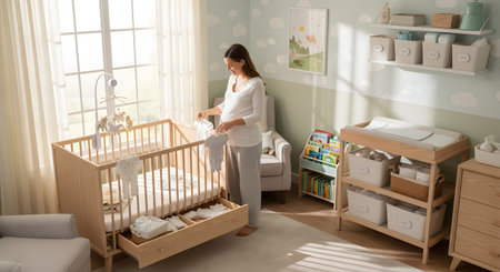 A happy pregnant woman stands in a beautifully decorated nursery, organizing small baby clothes near a wooden crib. The scene captures the anticipation and joy of expecting a new child in a cozy, pastel-colored room.