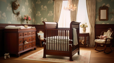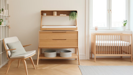 Beautifully designed nursery featuring a wooden crib, stylish decor, and a cozy atmosphere with natural light, perfect for creating a serene space for your baby.