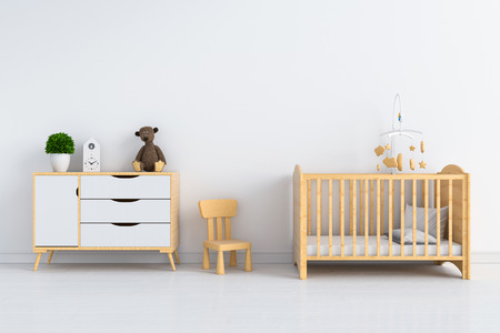 3d rendering children's room interior with a wooden crib and bedside table
