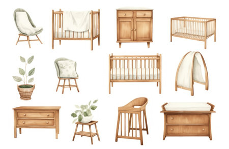 Set of baby furniture isolated on white background. Watercolor illustration. Scandinavian style. Natural materials furniture. Nursery decoration, crib, chair, changing table, chest of drawers, plants