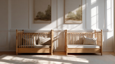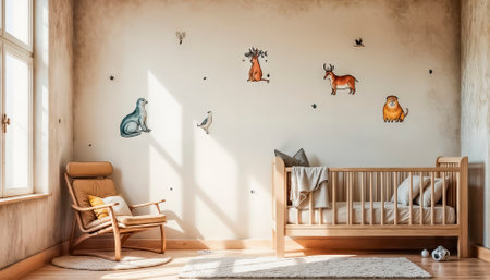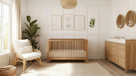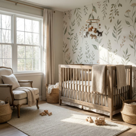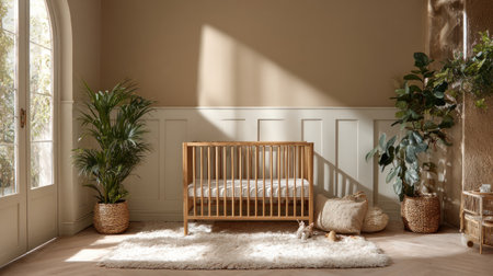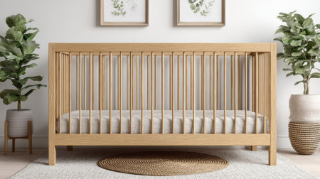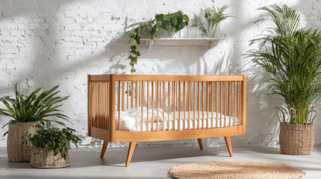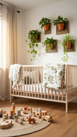 A serene nursery with a wooden crib and plants on the wall