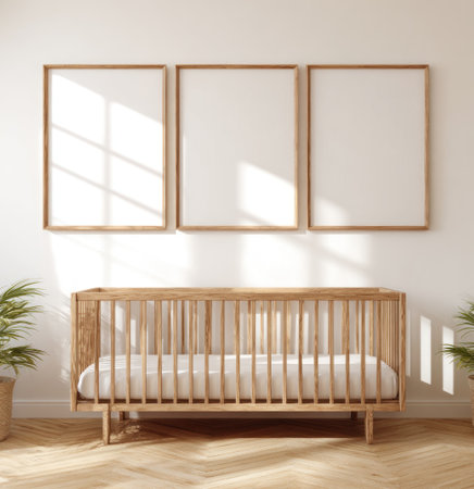 Kids child room interior with cradle and two A4 and square blank frames. 3d illustration.