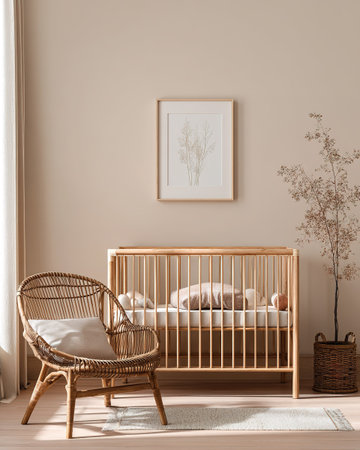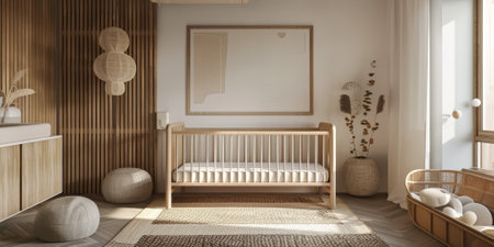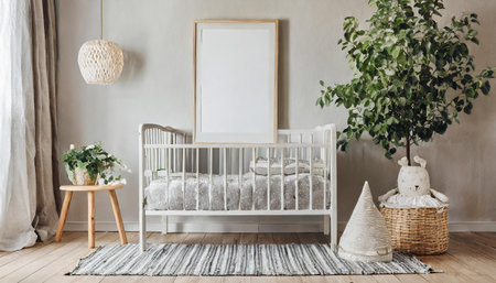 Mock up frame in cozy nursery interior background, Scandinavian style, 3D render
