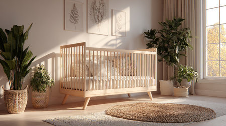A bright and airy nursery featuring a wooden crib, soft round rug, and potted plants, ideal for a welcoming and peaceful environment for a baby.