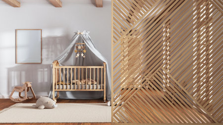 Wooden panel close-up, modern wooden nursery with crib and wallpaper, parquet floor. Minimalist zen interior design concept idea, contemporary architecture template