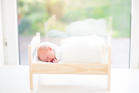 Adorable baby in white sunny bedroom. Newborn child relaxing on toy bed. Nursery for young children. Textile and bedding for kids. Family morning at home. New born kid during tummy time with toy bear.