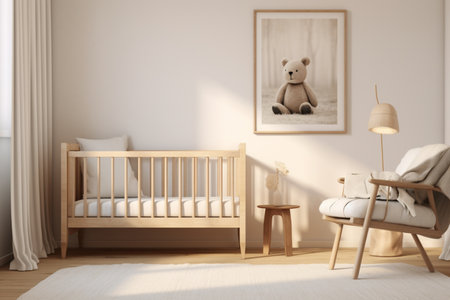 Baby room in scandinavian style with armchair and wood bed