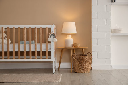 Crib, table, lamp and decor near beige wall indoors. Stylish baby's room interior