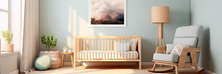 Modern interior design of nursery room with crib and rocking horse chair
