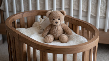 Soft teddy bear sitting alone in baby crib with bedding, symbol of childhood, care, safety, loneliness, sleep routine, parenting, emotional vulnerability, calm home atmosphere and early years concept