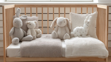 Cozy baby nursery featuring a crib with stuffed animals, organized shelves, and various wooden toys scattered on floor, adding warmth and charm to room