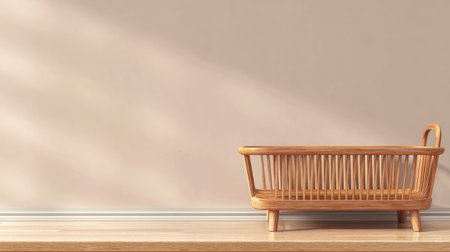 Children's wicker bed for babies in the interior of the children's room in light beige tones in the Scandinavian style