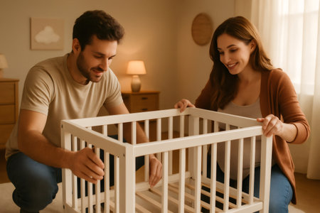 Person holding a screwdriver, assembling a white crib while a second person watches. They are in a cozy nursery environment with soft lighting