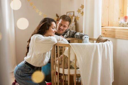 lovely couple beautiful wife and handsome husband both wearing warm sweaters standing near baby cradle in bedroom decorated for celebrating new year christmas family holiday.