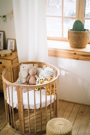 The interior of the childrens room in the Scandinavian style. A spacious, bright room with a bed for a baby.